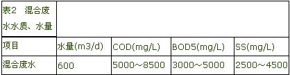 混合廢水的BOD5/COD一般為0.6~0.625,其可生化性較好,總水量為500~600m3/d,故處理站設(shè)計(jì)水量取600m3/d。根據(jù)該廠地理位置及環(huán)保要求,廢水經(jīng)處理后應(yīng)達(dá)到《污水綜合排放標(biāo)準(zhǔn)》(GB8978—1996)中的二級(jí)標(biāo)準(zhǔn)要求,即COD≤150mg/L ,BO D5≤60 mg/L,SS≤200mg/L,pH=6~9。