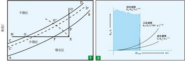 根據(jù)大量試驗(yàn)的結(jié)果證實(shí),溶液的過(guò)飽和與結(jié)晶的關(guān)系可用上圖1表示;圖中的AB 線為普通的溶解度曲線,CD 線代表溶液過(guò)飽和而能自發(fā)地產(chǎn)生晶核的濃度曲線( 超溶解度曲線),它與溶解度曲線大致平行。這兩根曲線將濃度——溫度圖分割為三個(gè)區(qū)城。在 AB 曲線以下是穩(wěn)定區(qū),在此區(qū)中溶液尚未達(dá)到飽和,因此沒有結(jié)晶的可能。AB 線以上為過(guò)飽和溶液區(qū),此區(qū)又分為兩部分:在 AB 與 CD 線之間稱為介穩(wěn)區(qū),在這個(gè)區(qū)域中,不會(huì)自發(fā)地產(chǎn)生晶核,但如果溶液中已加了晶種, 這些晶種就會(huì)長(zhǎng)大。 CD 線以上是不穩(wěn)區(qū),在此區(qū)域中,溶液能自發(fā)地產(chǎn)生晶核。若原始濃度為 E 的潔凈溶液在沒有溶劑損失的情況下冷卻到 F 點(diǎn),溶液剛好達(dá)到飽和,但不能結(jié)晶,因?yàn)樗€缺乏作推動(dòng)力的過(guò)飽和度。從F 點(diǎn)繼續(xù)冷卻到 G 點(diǎn)的一段期間,溶液經(jīng)過(guò)介穩(wěn)區(qū),雖已處于過(guò)飽和狀態(tài),但仍不能自發(fā)地產(chǎn)生晶核。只有冷卻到 G點(diǎn)后,溶液中才能自發(fā)地產(chǎn)生晶核,越深入不穩(wěn)區(qū)(例如達(dá)到 H 點(diǎn)),自發(fā)產(chǎn)生的晶核也越多。由此可見,超溶解度曲線及介穩(wěn)區(qū)、不穩(wěn)區(qū)這些概念對(duì)于結(jié)晶過(guò)程有重要意義。把溶液中的溶劑蒸發(fā)一部分,也能使溶液達(dá)到過(guò)飽和狀態(tài),圖中 EF ’ G’線代表此恒溫蒸發(fā)過(guò)程。在工業(yè)結(jié)晶中往合并使用冷卻和蒸發(fā),此過(guò)程可由 EG’’線代表。
