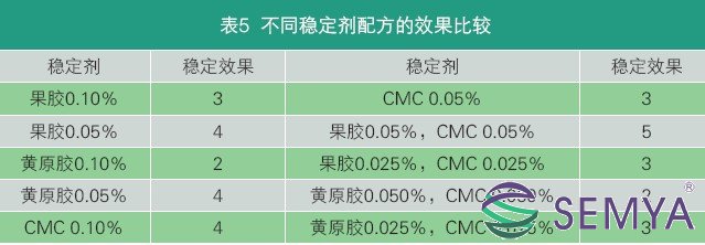 通過感官打分,比較出穩(wěn)定性最好的穩(wěn)定劑配方為:果膠0.05%,CMC 0.05%(均為質(zhì)量分數(shù))。
