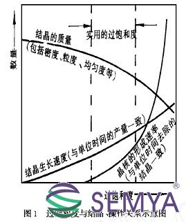 對(duì)結(jié)晶影響最主要的因素是溶液的過飽和度,如果溶液沒有過飽和度,晶核既不能生成,結(jié)晶也不能生長(zhǎng)。過飽和度大一些對(duì)生產(chǎn)有利,因?yàn)橥苿?dòng)力大,晶核的形成速率和結(jié)晶的生長(zhǎng)速率都大,但也不是越大越好。如果料液過飽和度太大,晶核形成速率很快上升,使結(jié)晶生長(zhǎng)速率降低,會(huì)出現(xiàn)產(chǎn)品粒度過細(xì),影響產(chǎn)品質(zhì)量。過飽和度與結(jié)晶、操作關(guān)系示意如圖1 所示