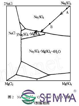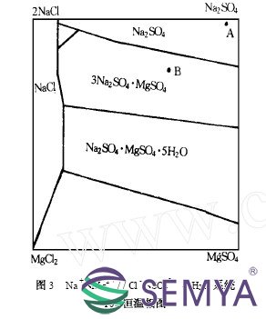 無水硫酸鈉生產(chǎn)所使用的原料中,除了主要的Na+ 、SO42 -離子外,一般都含有少量的Ca2 + 、Mg2 + 、和Cl -離子,生產(chǎn)時(shí)蒸發(fā)器內(nèi)壓力、溫度等條件保持不變,隨著蒸發(fā)的進(jìn)行,結(jié)晶的硫酸鈉不斷取出, 料液中Ca2 + 、Mg2 + 離子濃度相對(duì)增大, 體現(xiàn)在Na + 、Mg2 + // Cl -、SO42--H2O 相圖上,如開始在A 點(diǎn),生產(chǎn)一段時(shí)間后體系移到B 點(diǎn)見圖2, 繼續(xù)生產(chǎn),體系逐漸由Na2SO4 的結(jié)晶區(qū)移到Na2SO4 與復(fù)鹽3Na2SO4 ·MgSO4 的共飽線上,此時(shí)無水鈉鎂礬開始析出,在操作溫度不變情況下,體系將沿此共飽線移動(dòng),產(chǎn)品質(zhì)量開始下降。如果溫度升高時(shí),Na2SO4 的結(jié)晶區(qū)逐漸縮小,而3Na2SO4 ·MgSO4 的結(jié)晶區(qū)逐漸增大, 體系落在了3Na2SO4 ·MgSO4的結(jié)晶區(qū),顯然此時(shí)已不是我們所需要的產(chǎn)品了見圖3 。由于無水鈉鎂礬的結(jié)晶顆細(xì)小,在粘度較大的硫酸鈉溶液中不易沉降,蒸發(fā)罐內(nèi)就會(huì)呈現(xiàn)糊狀,使蒸發(fā)無法正常進(jìn)行,結(jié)晶也不會(huì)再繼續(xù)長(zhǎng)大,排出的料液經(jīng)離心機(jī)脫水非常困難,濕硝中母液含量較大,氣流干燥也無法正常運(yùn)行,產(chǎn)品放置時(shí)間長(zhǎng)了便結(jié)為大塊。為避免上述現(xiàn)象發(fā)生,除對(duì)硝液進(jìn)行凈化外,應(yīng)適當(dāng)降低排料溫度,即降低蒸發(fā)終溫。從圖2 、圖3 中可以看出,Na2SO4的結(jié)晶區(qū)隨著溫度的降低而增大,這不僅提高了產(chǎn)品產(chǎn)量,而且極大的降低了雜鹽的析出量,大大提高了產(chǎn)品質(zhì)量。那么是不是排料溫度越低越好呢? 也不是,圖4 是Na2SO4 -H2O 系統(tǒng)相圖,從圖中可以看出,硫酸鈉溶解度在32138 ℃最大,低于此溫度時(shí),系統(tǒng)不再結(jié)晶Na2 SO4 , 而是結(jié)晶出Na2 SO4 ·10H2O 。當(dāng)料液溫度接近32138 ℃時(shí), 由于硫酸鈉溶解度增大,產(chǎn)量將受到影在水中響, 這對(duì)生產(chǎn)是不利的。